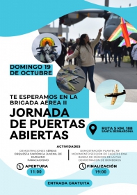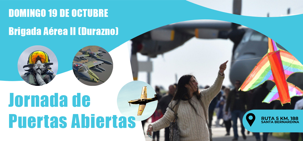 La Fuerza Aérea Uruguaya invita a los medios de comunicación a cubrir la Jornada de Puertas Abiertas en la Brigada Aérea II, ubicada en Ruta 5 km 188, Santa Bernardina (Durazno), el domingo 19 de octubre.