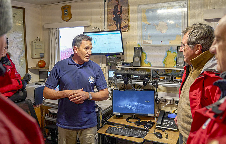 Asimismo, la delegación visitó otras bases ubicadas en la Isla Rey Jorge. En las instalaciones de la Armada Chilena, el Jefe de la Fuerza Armada en la Antártica, Capitán de Fragata Felipe Torres, ofreció una exposición sobre las operaciones del Servicio de Búsqueda y Salvamento Marítimo (SAR). Explicó cómo esta unidad desempeña un papel fundamental en la seguridad marítima de la región, operando a través de una red de centros de coordinación y patrullas encargadas de supervisar y asistir embarcaciones en el Mar de Drake y en aguas antárticas bajo su jurisdicción, garantizando una respuesta eficaz ante emergencias en esta zona.