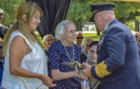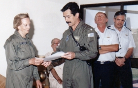 Al regresar, Mirta recibió un diploma certificado del vuelo y un pañuelo de seda del Escuadrón, mientras entregaba un cuadro alegórico al May. (Av.) Walter Martínez. Este momento marcó un reconocimiento profundo a su aporte a la aviación y su legado perdurable.