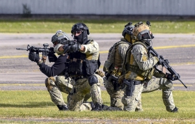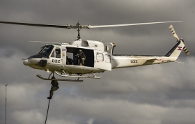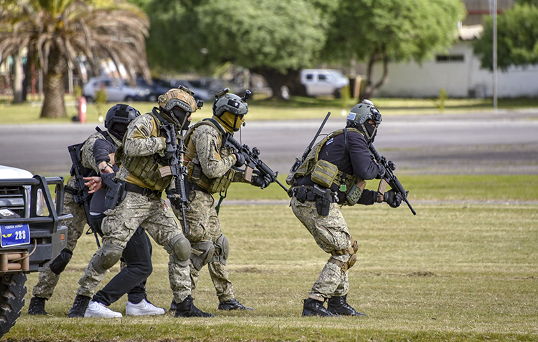 A continuación, se realizó un simulacro de captura de un Individuo de Alto Valor (IAV). Durante esta maniobra se observó cómo un francotirador neutralizó el vehículo en el que se transportaba, con posterior despliegue de efectivos mediante soga rápida, detención del IAV, registro del vehículo y evacuación en aeronave.
