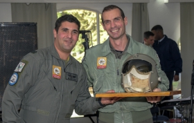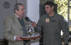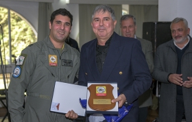 Posteriormente el Cnel. (Av.) (R) Shandelaio González entregó, en representación del Agrupamiento Simbólico N.º 5 “Búsqueda y Rescate”, un presente institucional al Escuadrón Aéreo N.º 5, como gesto de hermandad entre generaciones de aviadores que han compartido la vocación de servicio en las tareas más exigentes.