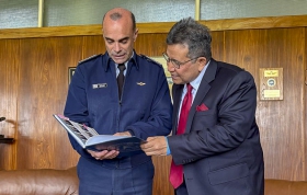 El pasado jueves 28 de agosto, el jefe del Estado Mayor General de la Fuerza Aérea, Brig. Gral. (Av.) Juan J. Méndez, acompañado por su equipo de trabajo e integrantes del Comando Aéreo Logístico encabezados por el Cnel. (Av.) Julio Bardesio, recibió al Embajador Extraordinario y Plenipotenciario de la República de Indonesia en la República Argentina, concurrente ante la República del Paraguay y la República Oriental del Uruguay, Excmo. Sr. Sulaiman Syarif.