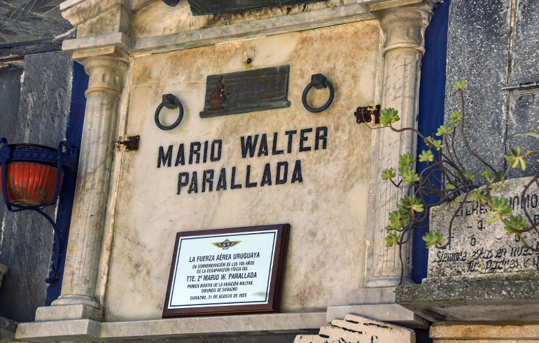 Hace un siglo, la Fuerza Aérea Uruguaya perdió a uno de sus jóvenes pioneros. El Tte. 2.° Mario Walter Parallada, con tan solo 26 años, entregó su vida en un vuelo de práctica a bordo de un SPAD monoplaza de combate, dejando tras de sí un ejemplo de entrega, valor y compromiso con la patria. Integrante de la primera escuadrilla de caza, su memoria permanece viva, y la Brigada Aérea II lleva con honor su nombre como tributo eterno a su sacrificio.