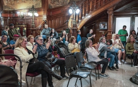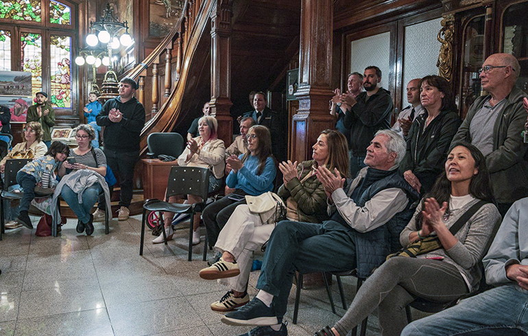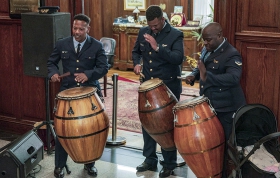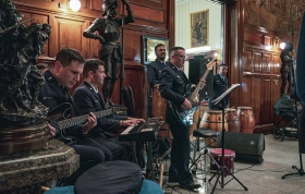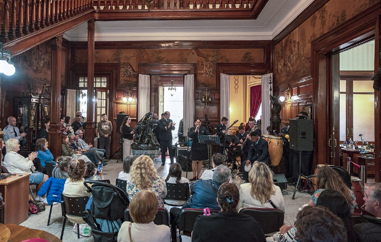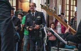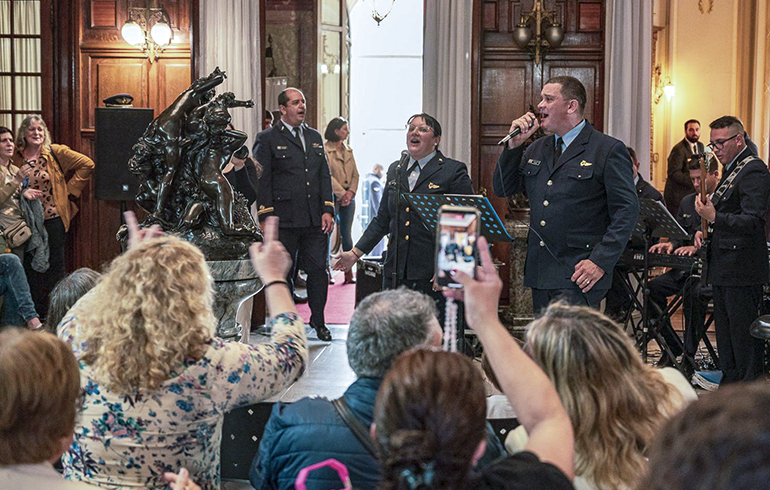 A pesar de las condiciones climáticas adversas que impidieron realizar el concierto al aire libre, la banda ofreció su espectáculo en el interior del Ministerio, llenando de música el ambiente.