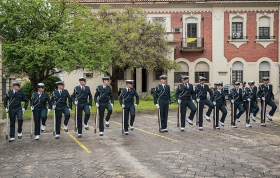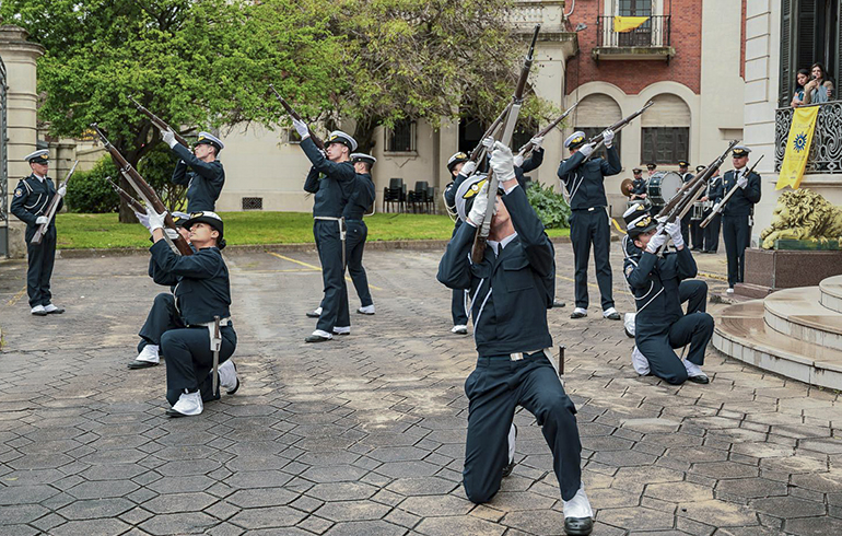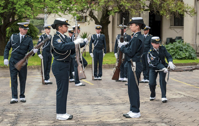 Al cierre de la presentación, los alumnos de la Escuela Técnica de Aeronáutica realizaron un movimiento automático de fusil, una demostración de precisión y disciplina ejecutada al son de un potente riff de tambores que cautivó a todos los presentes.