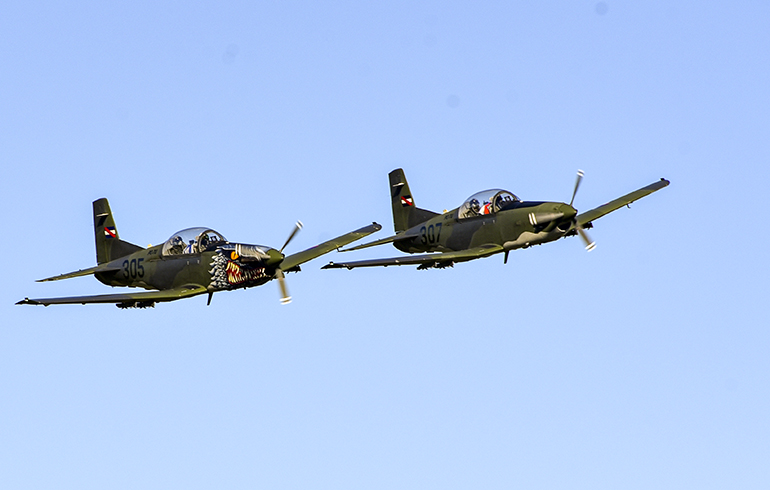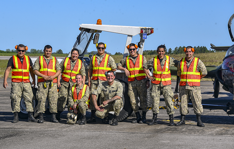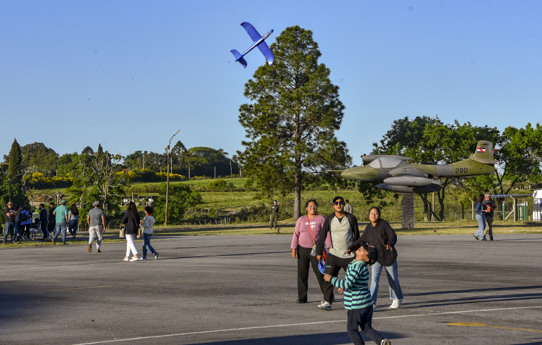 La jornada contó con demostraciones aéreas de diferentes aeronaves como el A-37, PC-7, UB-58 y U-206, además de un impactante lanzamiento de paracaidistas que despertó el entusiasmo de los presentes.