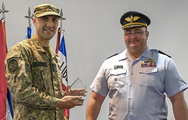 A continuación, se reconoció a los alumnos de los cursos internos y externos que obtuvieron los mejores promedios y calificaciones en el presente año lectivo, así como a aquellos que tuvieron una destacada actuación. Por los cursos regulares avanzados fueron reconocidos el AT 3.ª Gastón Umpiérrez, el AT 3.ª Erick García, el AT 3.ª Pablo Galván, el AT 3.ª Jason Chagas, el AT 3.ª Manuel Franco, el Sr. Santiago Trujillo y el Sr. Facundo Monzón. Por su desempeño en los cursos regulares básicos fueron reconocidas la Sdo. 1.ª (SG) Daniela Rodríguez y la Sdo. 1.ª (SG) Melody Silva. Por los cursos de pasaje de grado recibieron un reconocimiento la AT Ppal. Fabiana Acosta, el Cbo. 2da (SG) Guillermo Linkert, y el Sdo. 1.ª (SG) Lázaro Gigena. Por los cursos de capacitación fueron reconocidos el Sgto. 1.º (SG) Alejandro Borsani y el AT Ppal. Martín Piegas. Por los cursos de capacitación específica recibió un reconocimiento el Sdo. 1.ª (SG) Joaquín Jackson; mientras que el aspirante técnico Segundo año Guzmán Suárez y el aspirante técnico Primer año Aaron Pérez fueron distinguidos por su destacado papel como derechas de sus respectivos cursos.